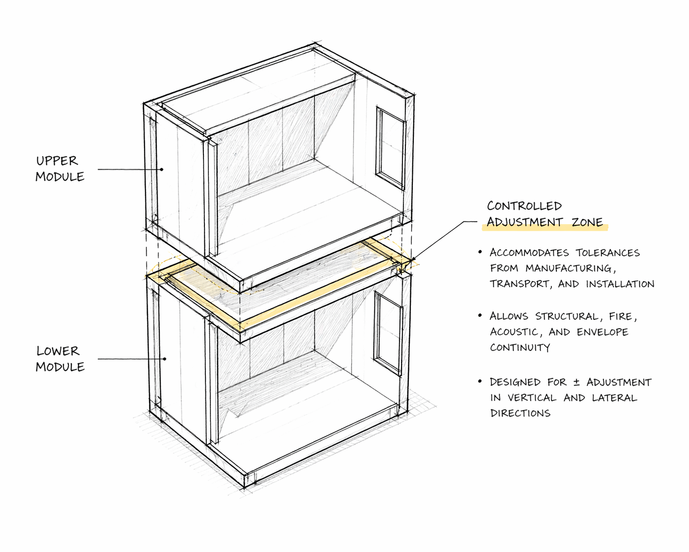 Given the inevitability of dimensional variation, successful modular design does not seek to eliminate tolerances, but to manage them. This is achieved by introducing controlled adjustment zones within the building system.