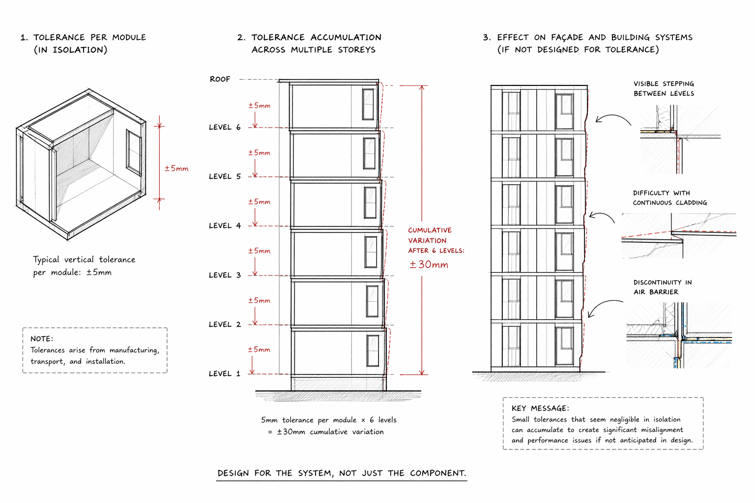 The critical issue is not any single source of tolerance, but the cumulative effect across multiple modules and storeys. This accumulation is what distinguishes modular construction from conventional approaches and is where most coordination challenges arise.